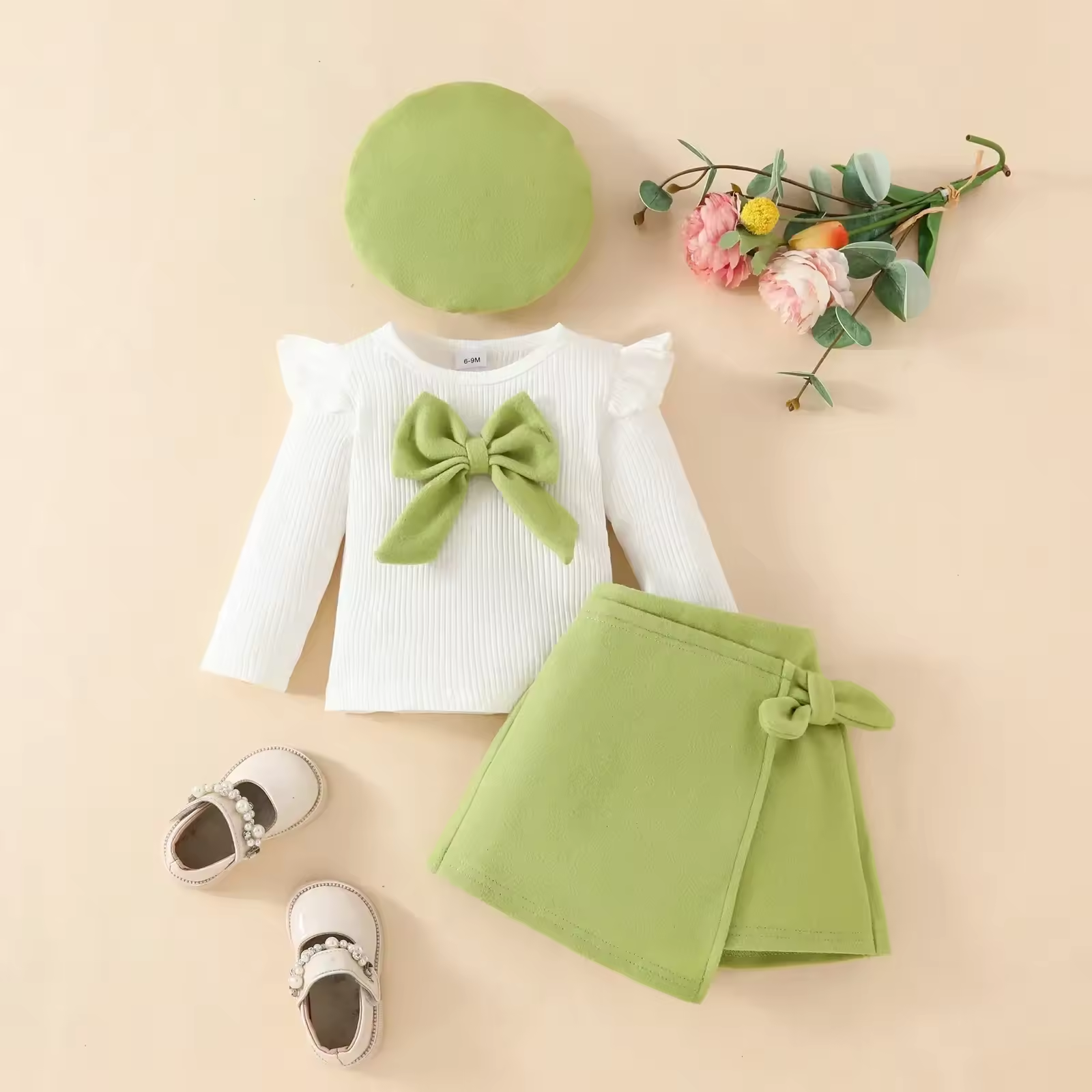 Conjunto de 0-3 años manga larga, top de lazo grande falda irregular y boina, 3 piezas de ropa para niñas.